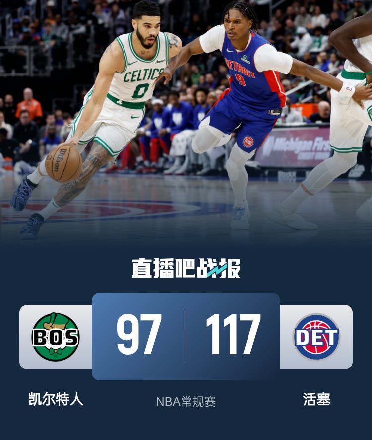 比赛开始,塔图姆高效输出,活塞多点开花强势回应,此后凯尔特人连续出现失误,活塞稳扎稳打占据场上主动,次节活塞占得先机一度领先15分,凯尔特人外线开花轰进6记三分一举抹平分差,半场战罢双方战成55平。易边再战,活塞内外开花重获两位数优势,比斯利外线开火连中三分帮助球队不断扩大优势,末节活塞稳扎稳打,没有给对手反扑的机会,最终,活塞主场117-97击败凯尔特人,迎来8连胜的同时终结了对手的6连胜。
