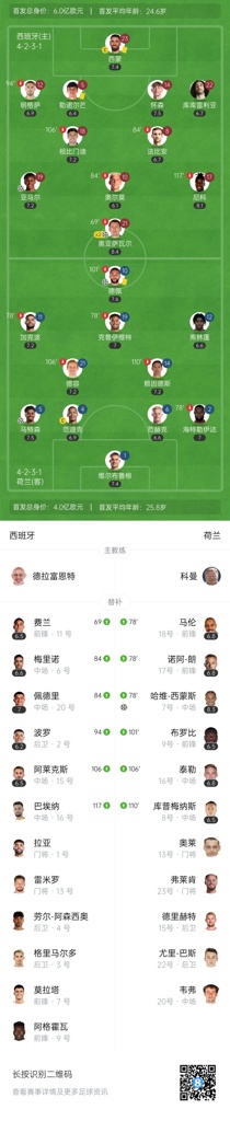 第67分钟,西班牙后场断球反击,尼科-威廉姆斯接到队友直塞,吸引防守后分球给到无人盯防的奥亚萨瓦尔,奥亚萨瓦尔左脚攻门被维尔布鲁根扑出,随后头球补射打进,西班牙2-1荷兰。↓